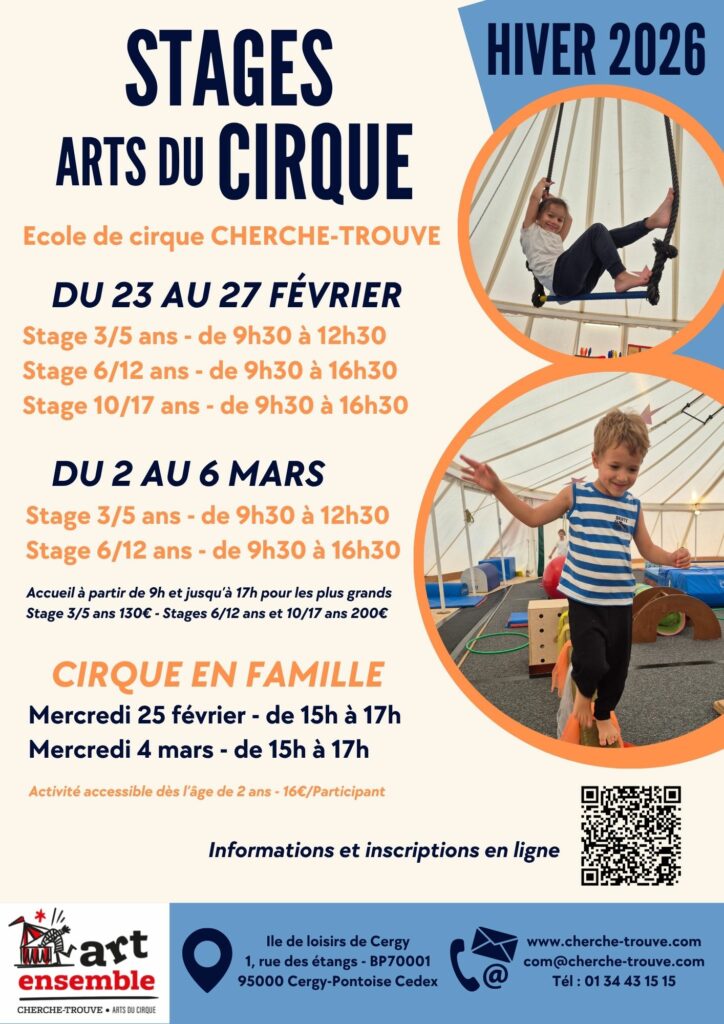 L’école de cirque proposera 2 périodes de stage cet hiver : lundi 22 et mardi 23 décembre 2025 (1ère semaine des vacances scolaires de Noël) et du 23 février au 6 mars 2026 (les 2 semaines des vacances d’hiver zone Ile de France).